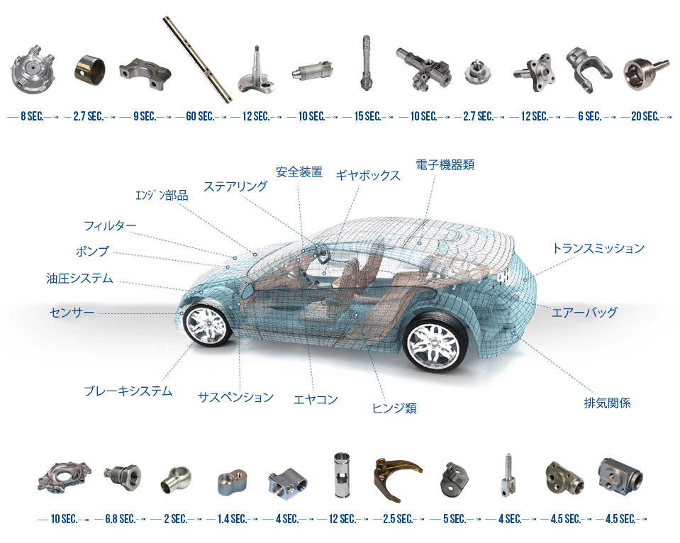 自動車部品の設計・検証テスト及びサービスは自動車分野で充分な経験を積んだ専門のスタッフが注意深くフォローします。客先トレーニングには特に入念な注意を払います。世界をリードする自動車メーカーの数多くの部品が欧米市場に納入されたBUFFOLI機で生産されています。