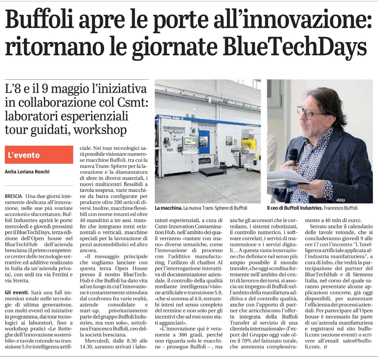 Sul Giornale di Brescia si parla dei BlueTechDays che si sono tenuti nelle giornate dell'8 e 9 maggio presso la sede del BlueTechHub di Via Ferrini.